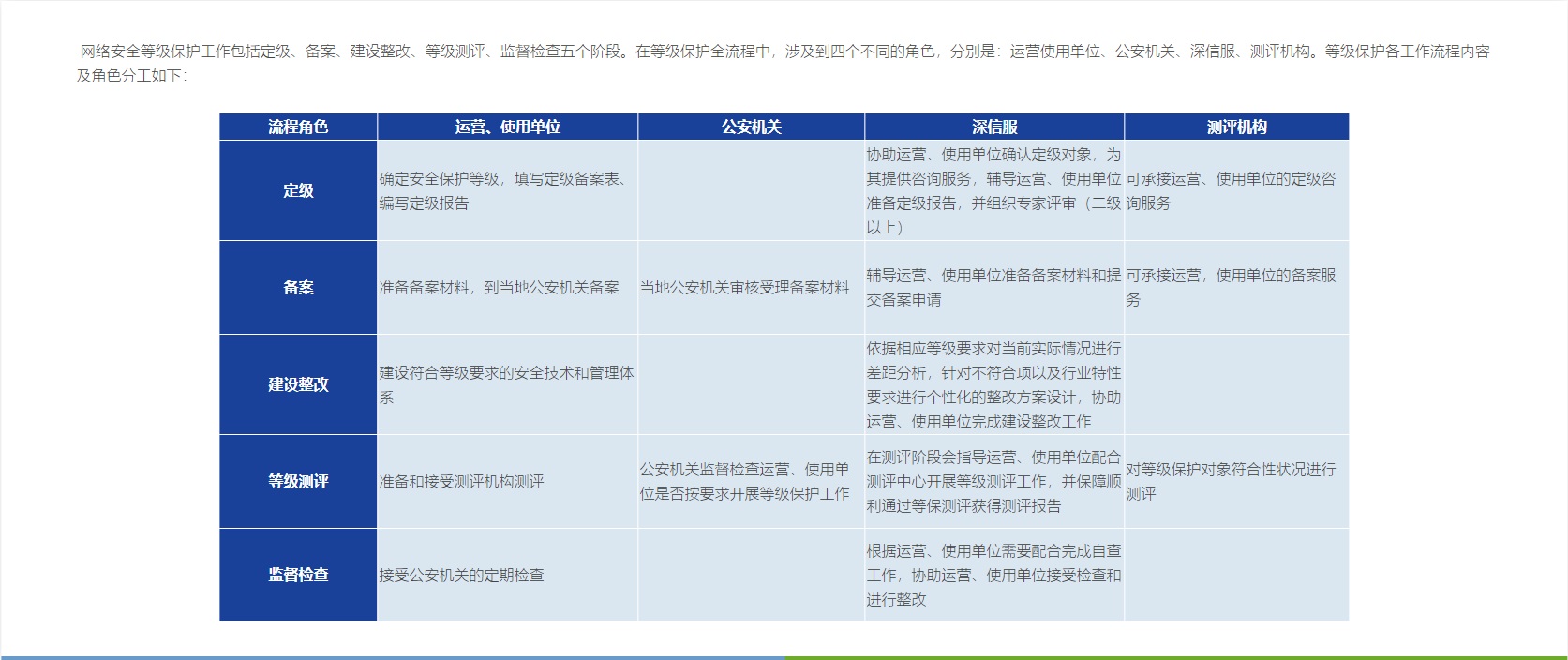 网络安全等级保护是国家网络安全保障的基本制度、基本策略、基本方法。开展网络安全等级保护工作是保护信息化发展、维护网络安全的根本保障,是网络安全保障工作中国家意志的体现。网络安全等级保护工作包括定级、备案、建设整改、等级测评、监督检查五个阶段。